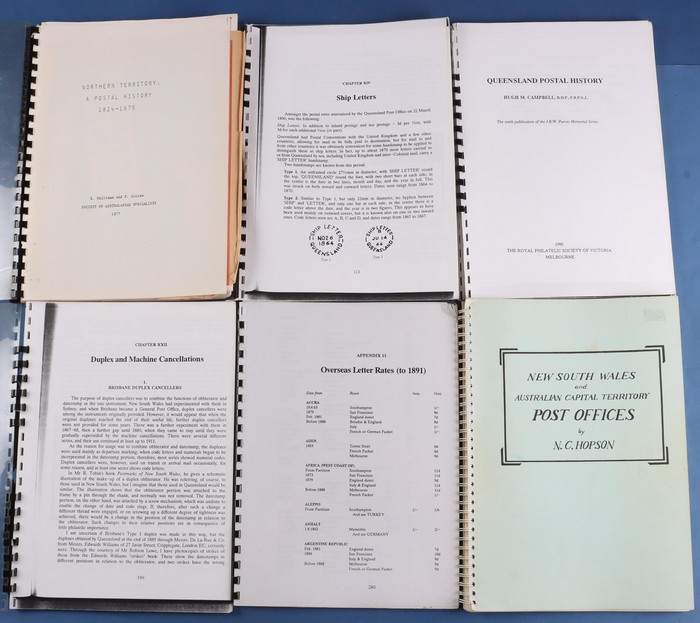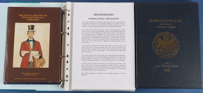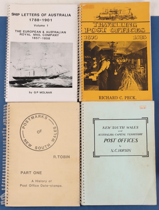 Wales library inc The Postal History of NSW 1788-1901 (J White, 1988), History of the Post Office (Houison, 1890, reprint 1983), NSW Post Offices (Hopson, 1984), NSW & ACT Post, Receiving, Telegraph & Telephone Offices (Hopson & Tobin) 4 volume set,