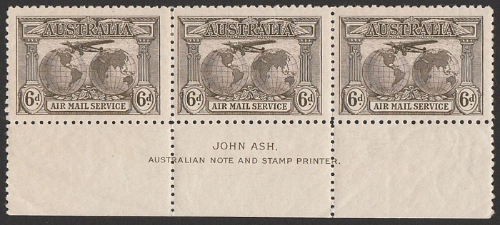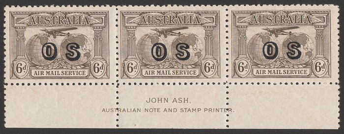 dull brown opt OS. Plate 1 Ash imprint strip of 3. Fine M. SG 139A. ACSC 144(OS) zd cat $400 x6 for strip of 3 $240. (Image1)