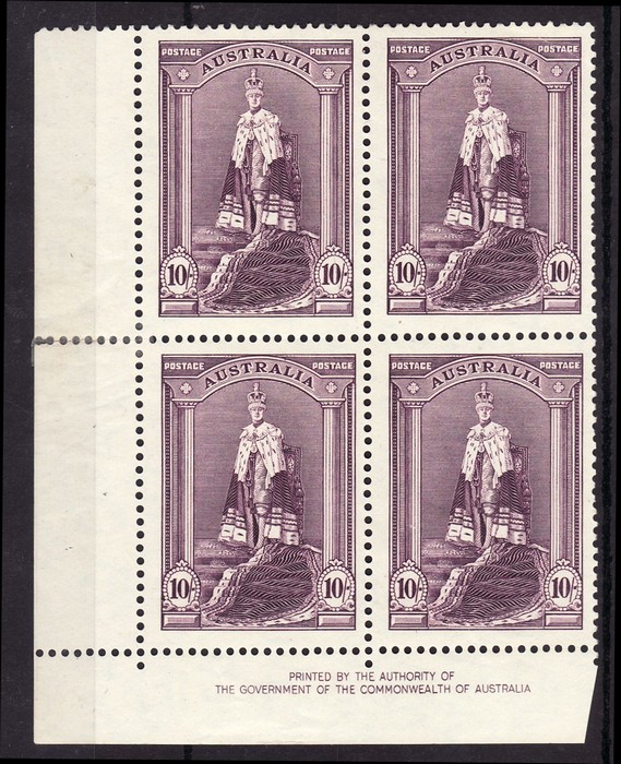 10/- thick paper Authority imprint blk of 4. Hinged at lower selvedge, stamps F-VF MNH. ACSC 214 za cat $250. (4) (Image1)