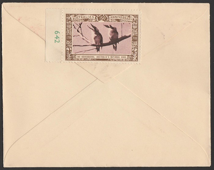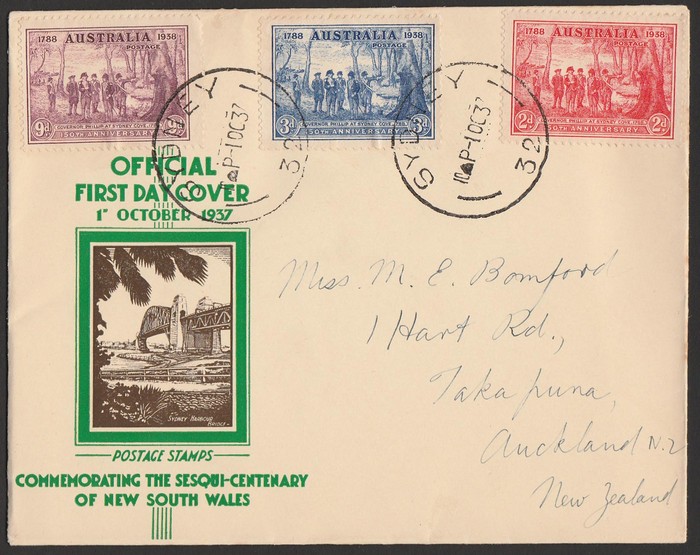2d, 3d, 9d on pictorial FDC to NZ, pmk Sydney Oct 1937 with 150th Anniv label on reverse. (Image1) (Image2)