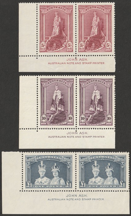 10/- & £1 thick paper Ash imprint prs. VF fresh MNH, W/C. SG 176-78(var) cat £300 as 2 sets. ACSC 212z, 214z, 216z cat $775. (P) (Image1)