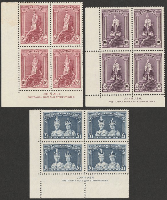 10/- & £1 thick paper Ash imprint LL cnr imprint blks of 4. VF fresh MNH, W/C. SG 176-78 cat £600++ as singles. ACSC 212-216z cat $1325. (12) (P) (Image1)