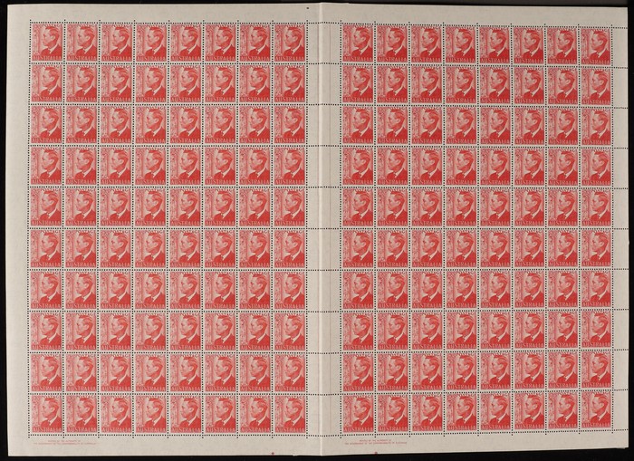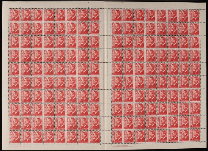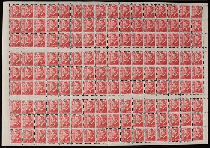 scarlet sheet of 160 with perf-pips at top & both Authority imprint. Scattered tropical/tone spots affecting around 20-25 stamps. ACSC 251b zj zh cat $370. (160)