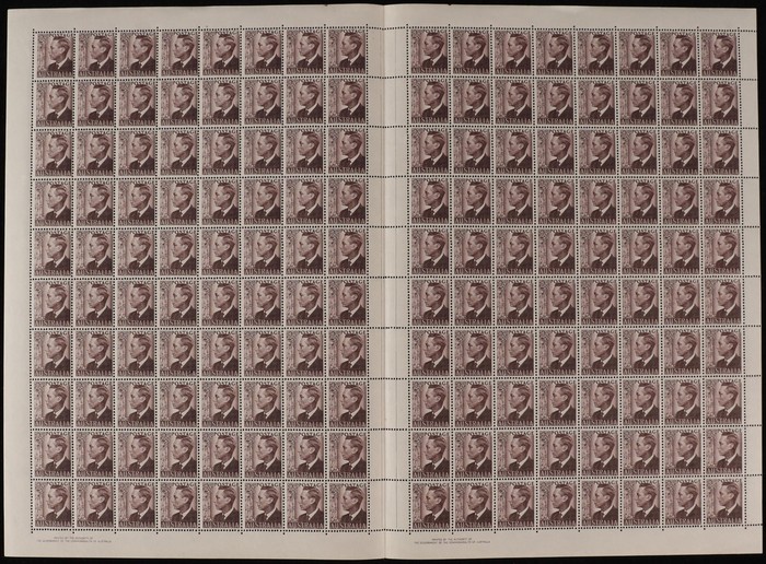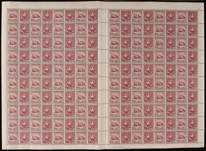 Stamp Centenary 2½d pr, sheet of 160 (butterfly folds) with comp perf-pips at base & both Authority imprints. Minor adhesion to central gutter o/w fresh MNH. ACSC 278, 279 ba zf cat $350. (160) (Image1)