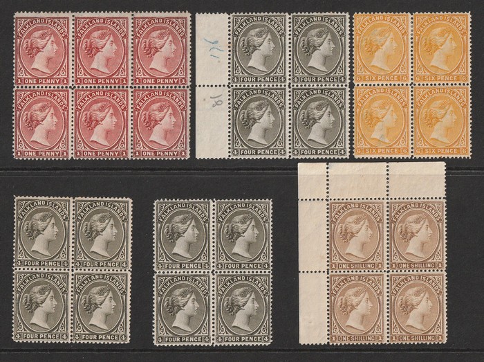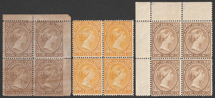 blks selection inc 1878-79 1/- blk of 4 & blk of 8, no wmk. 1891-1902 1d, 2 blks of 4, plus blk of 6, all diff shades. 4d, 3 blks of 4, 6d blk of 4 & 1/- blk of 4. Also 1d, 2 blks of 9 (diff shades). Mostly F-VF M/MNH, some mixed. SG cat £2000+