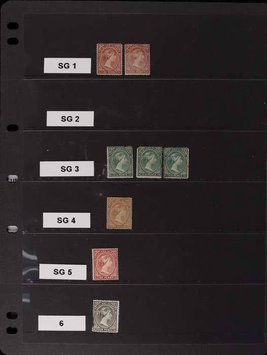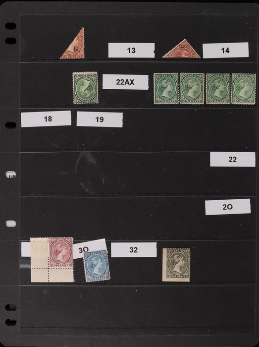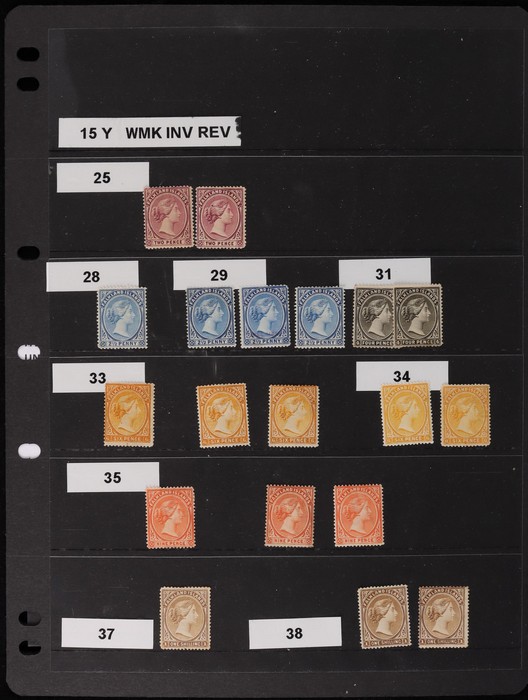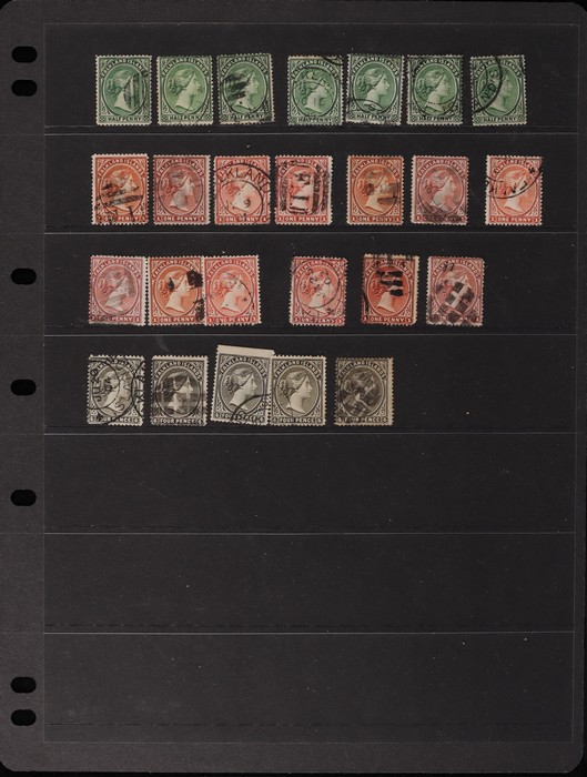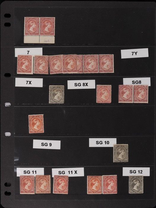 collection inc 1878-79 QV 1d (2), 6d (3) & 1/- (no wmk). 1882 QV 1d & 4d, wmk Crown CA upright. 1885-91 QV 1d & 4d, wmk sideways inc shades. 1889-91 QV 1d & 4d, wmk upright inc shades & wmk reversed. 1891 Bisect ½d on 1d top & bottom halves.