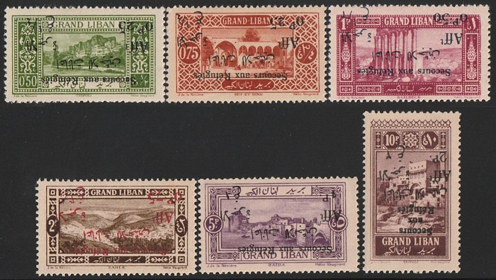 Refugees opts, 0.50 + 0.25p, 0.75 + 0.25p, 1p + 0.50p, 2 + 0.75p, 5p + 1p & 10p + 2p, all error opt INVERTED. VF fresh MNH. SG ex 80-89 footnote cat £390 for M, should be at least double, £780 MNH. Yv ex 64a-73a cat €760. 2025
