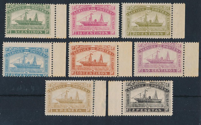 Posts: 1899 Tanger El Ksar Ship set 5c-2P. Mostly F-VF MNH, 20c & 1P M, few small spots, all nice fresh colours. Yv 113-20 cat €495. (8). (P) (Image1)