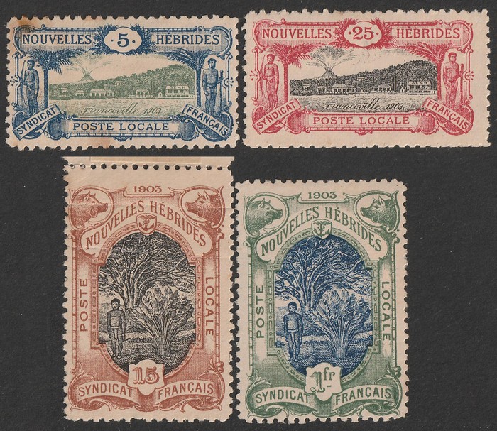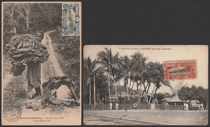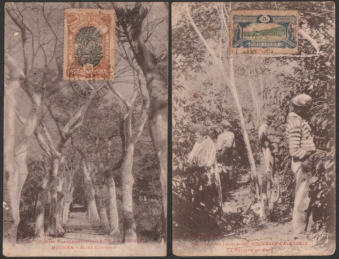 Syndicat Francaise set 5c (2), 15c & 25c tied on New Hebrides PPC (1) or on New Caledonia PPC (3) - 1st with 'Pt Sandwich' 1906 pmks. F-VF sl tropicalised. Yv PL3-6 cat €1200 as loose stamps alone. Scarce Local Post. (P) (Image1) (Image2)
