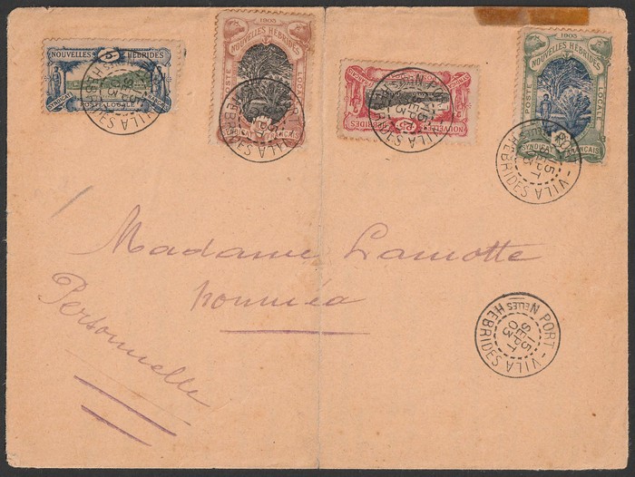Syndicat Francaise set 5c-1Fr tied to cover (centre fold & edge tape stain) by Port Vila Nelles Hebrides 15 SEPT 03' cds. Sent locally. Yv 3-6 cat €1200+ as loose stamps alone. (P) (Image1) (Image2)