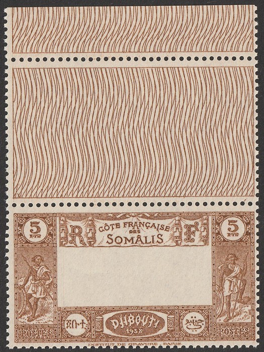 Pictorial 5Fr red-brown & brown, error red-brown centre OMITTED. VF fresh MNH, top marginal with full stamp size tab. SG 275a cat £700 for M, should be at least double, £1400 MNH. Yv 167a cat €930+. Probably only 1 sheet existed with
