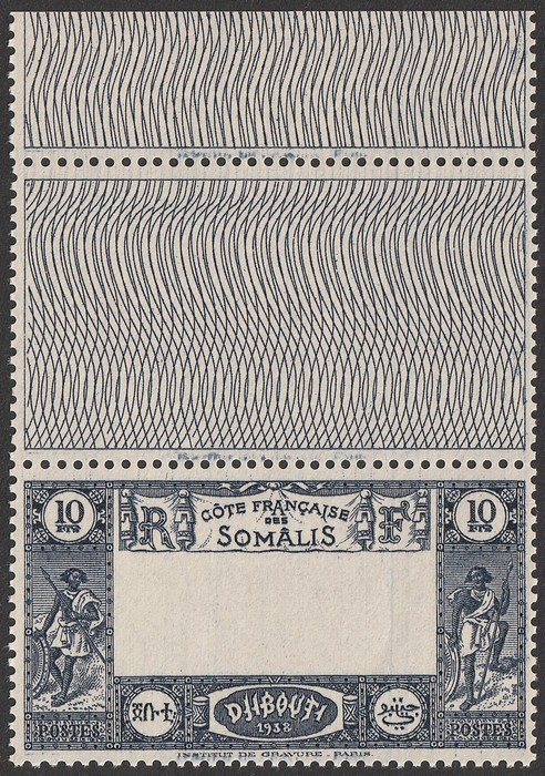 Pictorial 10Fr blue & indigo, error blue centre OMITTED. Superb fresh MNH, top marginal full stamp size tab. SG 276a cat £650 M, should be at least double, £1300 MNH. Yv 168a cat €930+. Probably only 1 sheet existed with 1 row of
