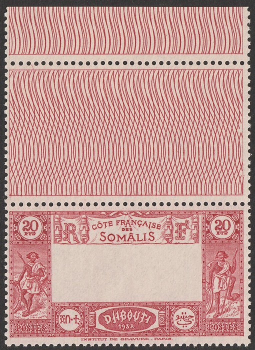 Pictorial 20Fr blue & carmine, error blue centre OMITTED. Superb fresh MNH top marginal with full stamp size tab. SG 277a cat £700 for M, should be at least double, £1400 MNH. Yv 169a cat €930+. Probably only 1 sheet existed so
