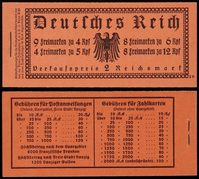 booklet 2RM with 1pf, 3pf, 5pf, 6pf, 8pf & 12pf in 4 panes. F-VF MNH, some sl gum tones. SG SB35 cat £1100. Mi MH35 cat €1100. (Image1) (Image2)