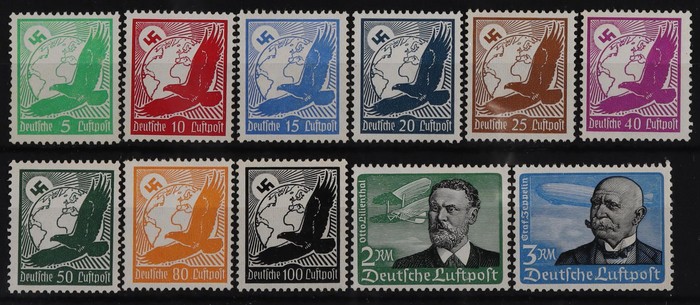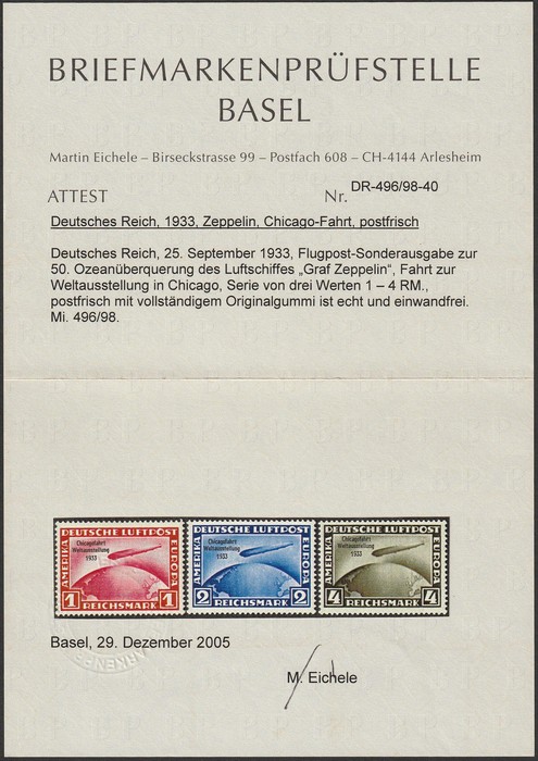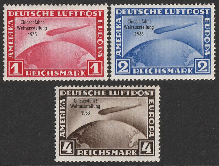 opt Zeppelin set 1RM-4RM with 'Chicagofahrt Weltaustellung 1933' opts. VF fresh MNH with never hinged original gum which is somewhat glazed. SG 510-12 cat £4750. Mi 496-98 cat €4300. 2005 Eichele photo cert. (3) (P) (Image1) (Image2)