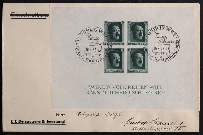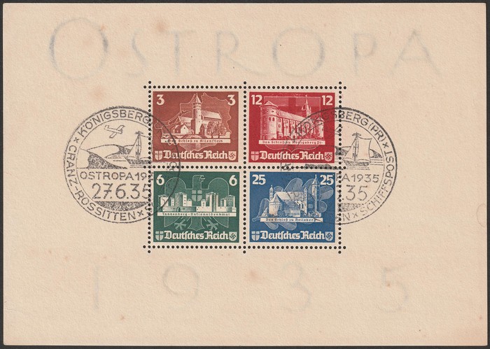 M/Sheet 3pf-25pf (149x105mm). VFU, sl tones, 'Ostropa 27 6 35 Rossitten Schiffspost' Exhib cds. Scott B68 cat US$825+. SG MS576a cat £1400+. Mi Blk 3 cat €1100, plus premium for scarce pmk. (P) (Image1)