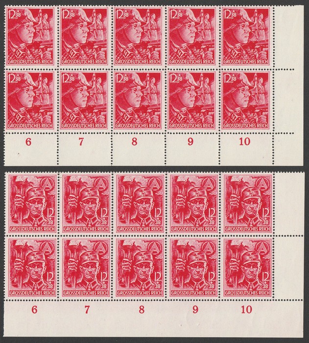 Troopers set 12+38pf scarlet, LR cnr blks of 10, with sheet row no. VF fresh MNH. Mi 909-10 cat €900+, SG 897-98 cat £1090+ both as singles, plus premium for blks. (2 blks of 10). (Image1)