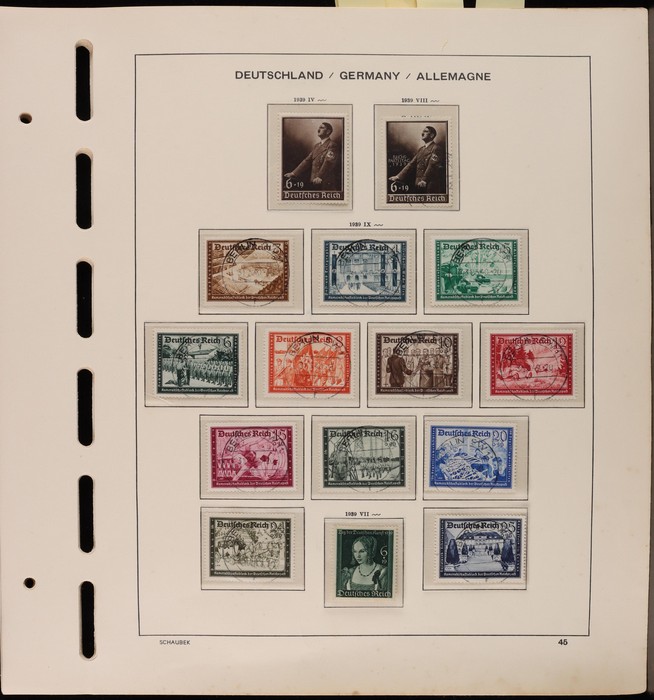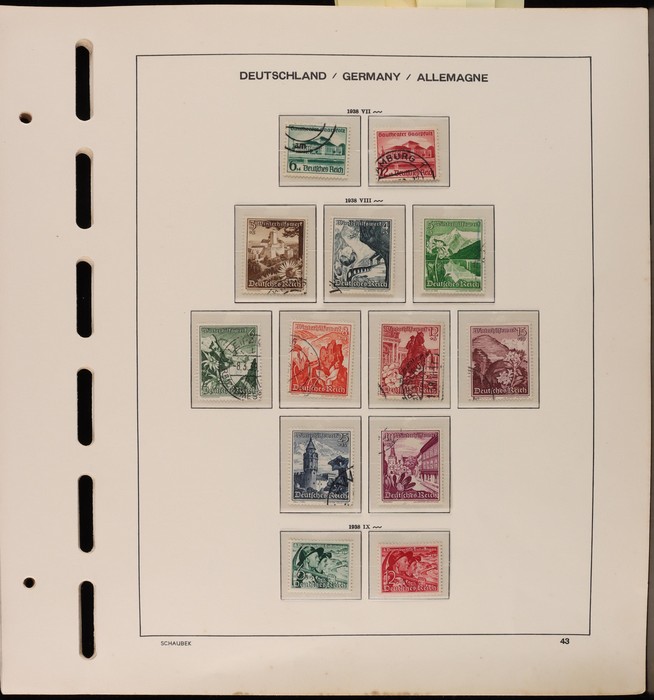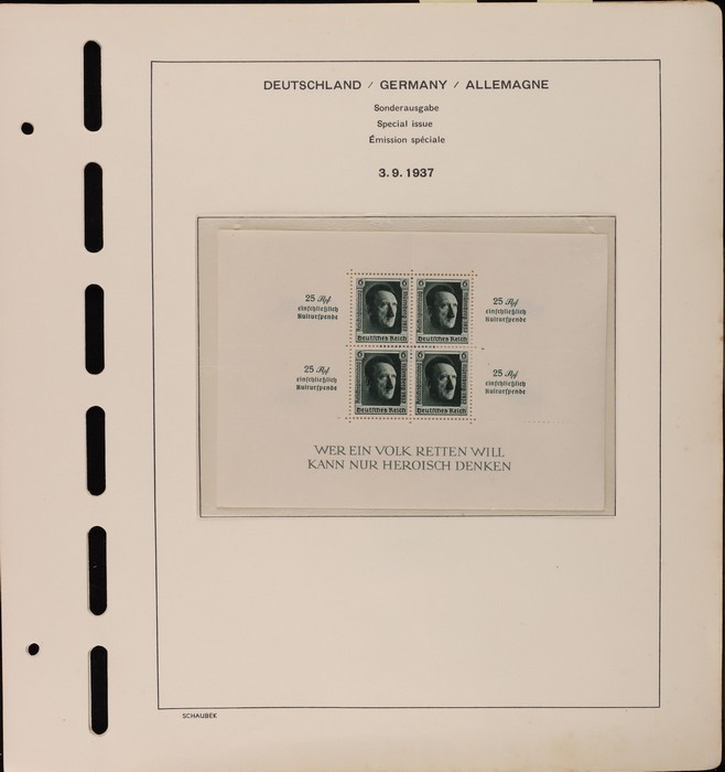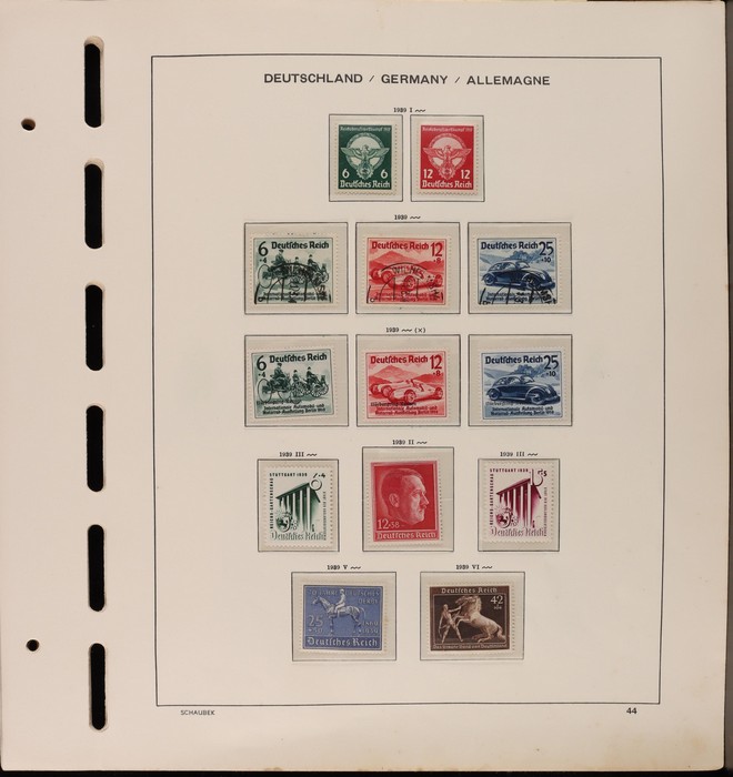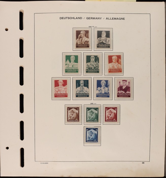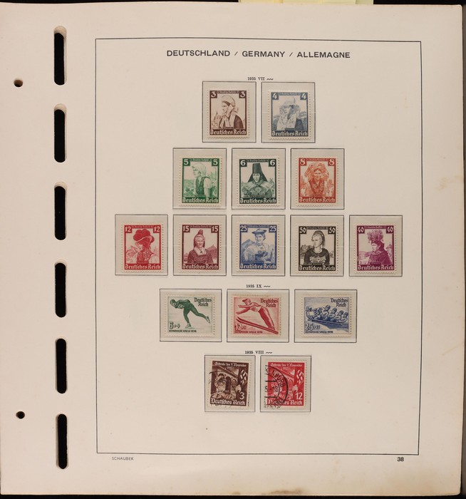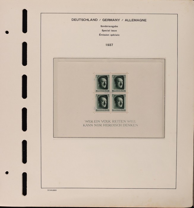 Third Reich collection in Schaubek album & Lighthouse hagner binder with slipcase inc 1933 Welfare set to 40pf (cat £450), 1934Welfare set to 40pf, 1936-45 issues fairly comp, 1935 M/S Philatelic Exhibition (cat £1600 unused), M/S 1936