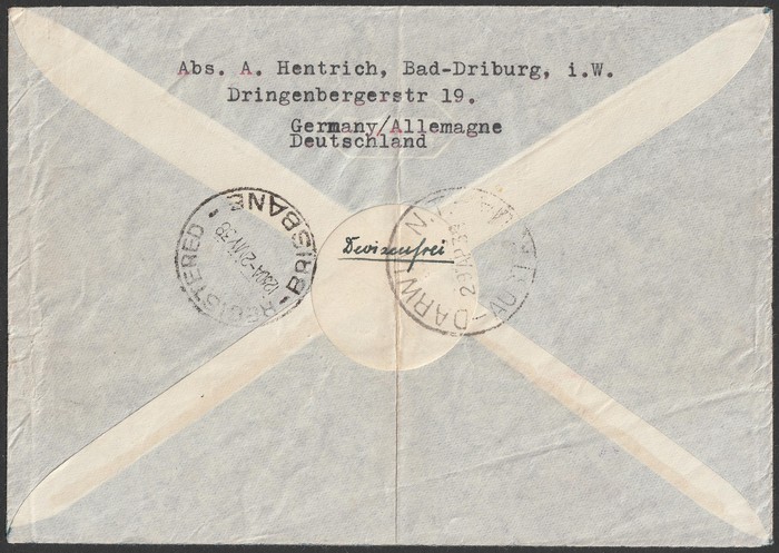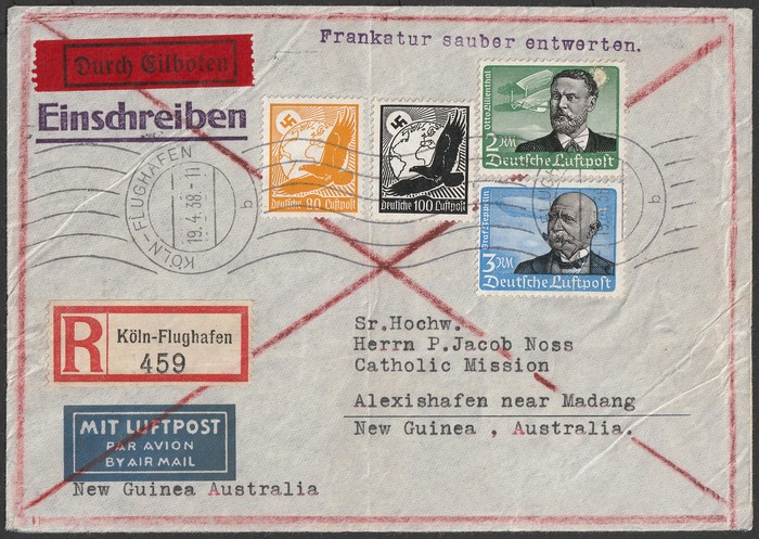 registered airmail cover to New Guinea! Franked, Germany 1934 Airs 80 & 100pf, 2mk & 3mks tied sent Koln-Flughafen 19-4-38' to Catholic Missions at Alexishafen near Madang (addressed to New Guinea, Australia) with 'Darwin 29 AP 38' & 'Brisbane 2 MY