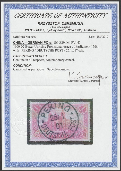 Boxer Rebellion provisional use of Parliament 1Mk red. Superb U, 'Peking Deutsche Post 25/1 01' cds. SG Z29 cat £900+. Mi PVi cat €700+. 2010 Ceremuga photo cert. (P)