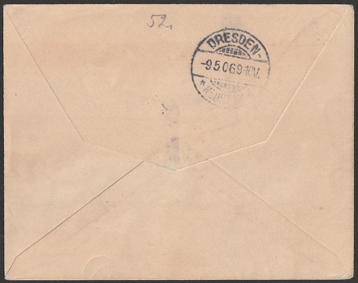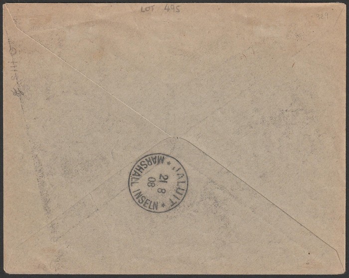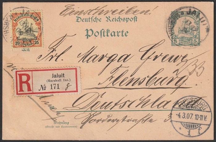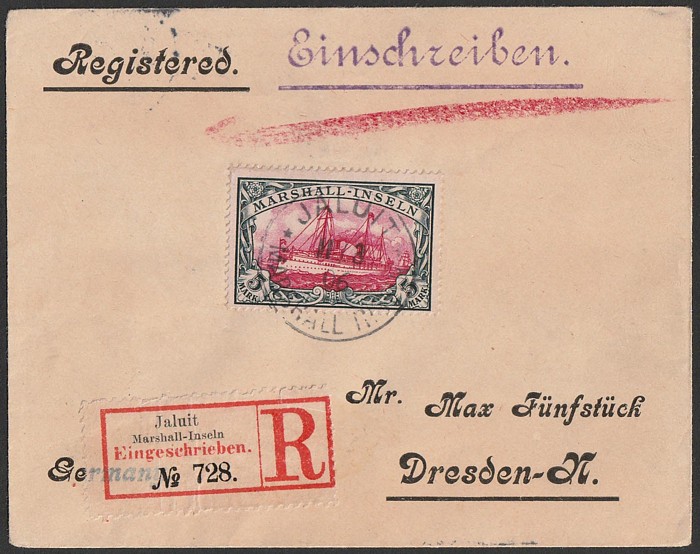 1906 Registered cover franked 1901 Yacht no wmk 5Mk red & black tied by 'Jaluit Marshall Islands' (11 Mar) cds, red & black reg label to Germany, Dresden arrival b/s. SG 23 cat £700 as loose stamp. Mi 25 cat €900 on such cover. (P) (Image1) (Image2)