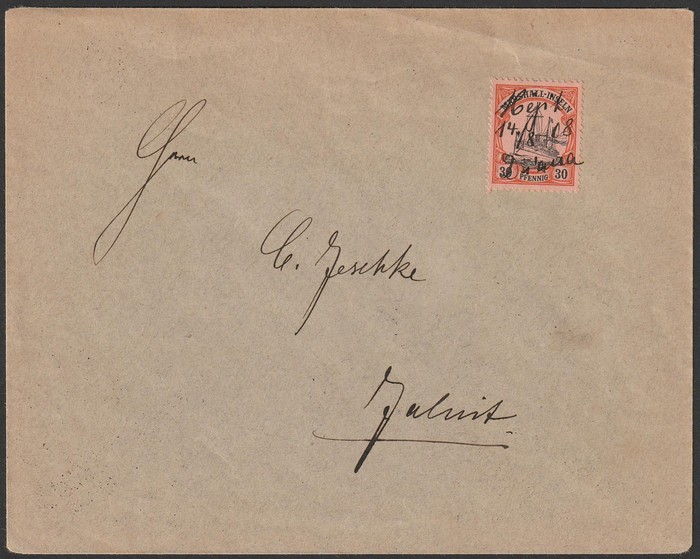 1908 Nauru Forerunner 'Atoll Post' cover franked Marshalls 30pf Yacht tied by m/s 'Mejit 14.8.08 Diana', b/s 'Jaluit 21 8 08 Marshall Inseln'. Attractive. (P) (Image1)
