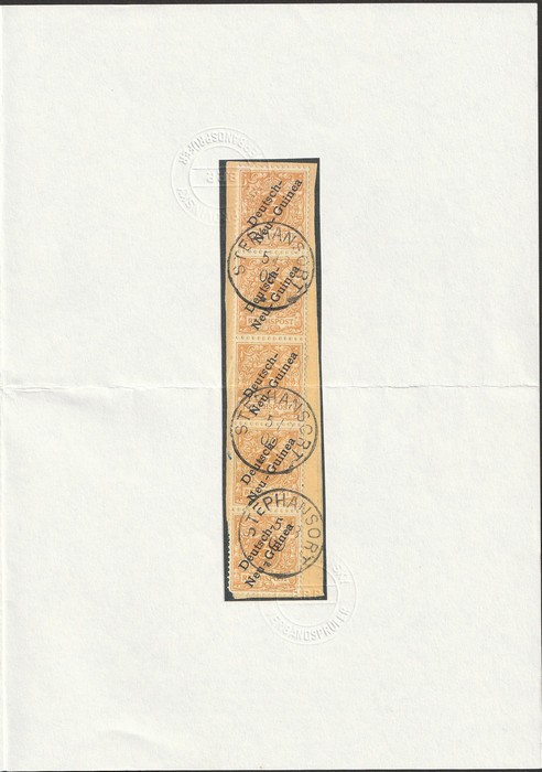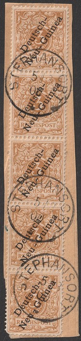 opt Eagle 3pf Light ochre-brown strip of 5. VFU on piece with 'Stephansort 5.3.00' cds Powell T7. SG 1 cat £240++. M16 cat €350++ both as singles. 2003 Provinsky BPP photo cert. (5). (P) (Image1) (Image2)