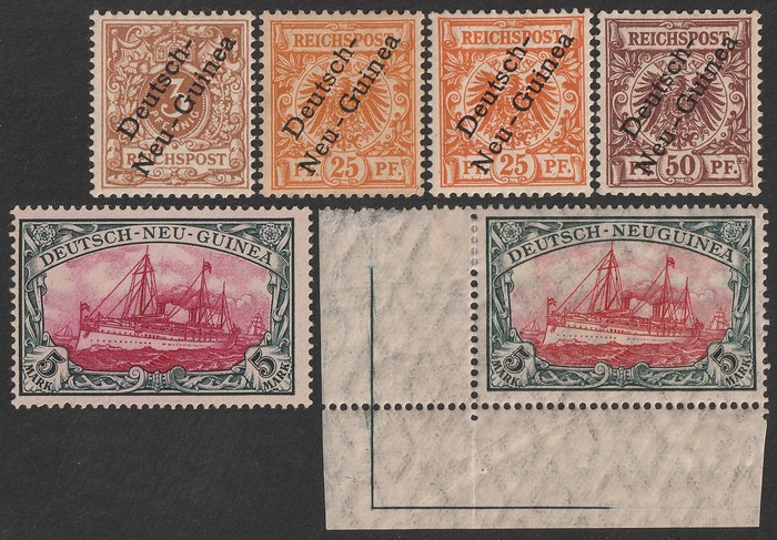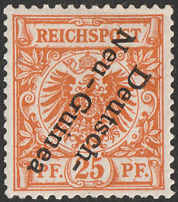 'Deutsch-Neu-Guinea' opt Eagle 25pf orange, error opt INVERTED. Superb fresh M with nice original gum & bright colour. Scott 5a cat US$2100, SG 5(var), Mi 5bk cat €2800. Only 1 sheet printed, which was discovered before it was sent to the