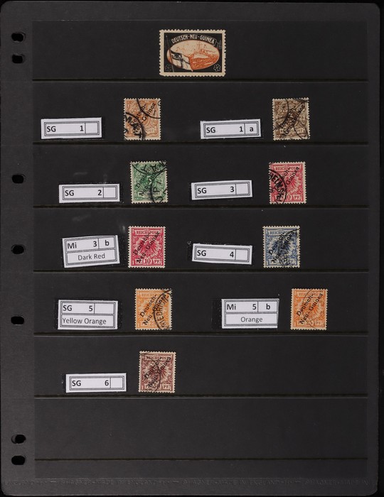 1880s-90s Forerunners of German issues with 1891 Numeral 2Mk (2) both Stephansort cds, 1888 Eagle 50pf rejoined pr with Finschafen 1889 cds, 1890-97 2pf grey CTO Berlinhafen, 5pf green (3) all Friedrichwilhelmshafen cds, 10pf red (2) Herbertshohe &