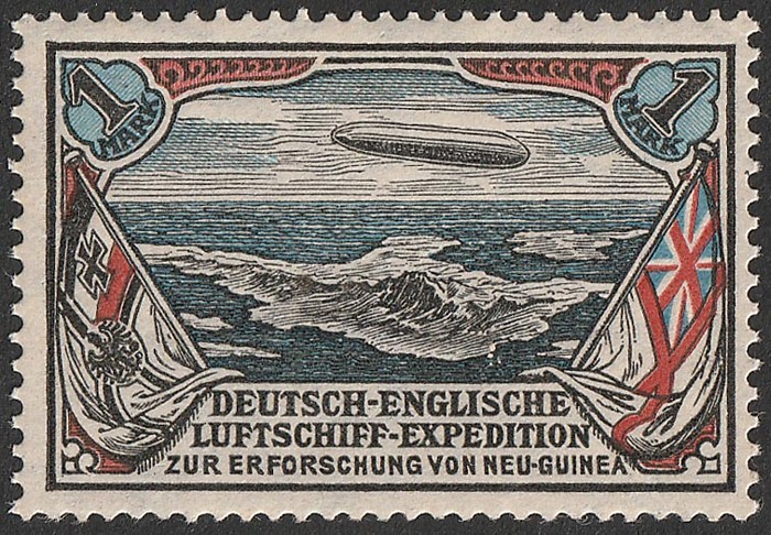 Zeppelin 1Mk black, blue & red, wmk crosses & circles. (printed by the Imperial German Print Works in Berlin as a fundraising stamp for planned German/British expedition to explore New Guinea, which was cancelled due to the outbreak of war). VF fresh