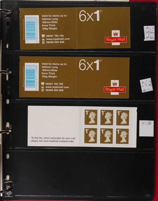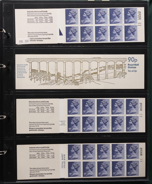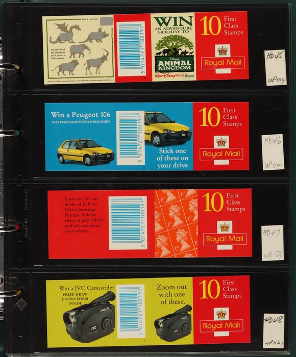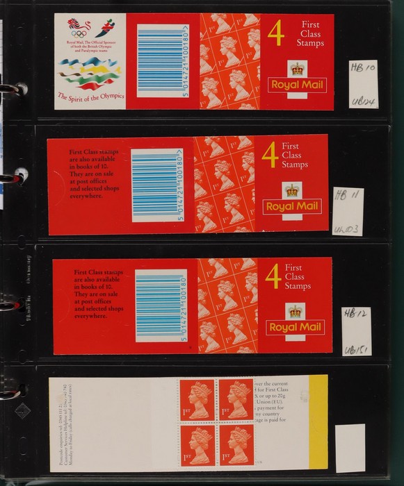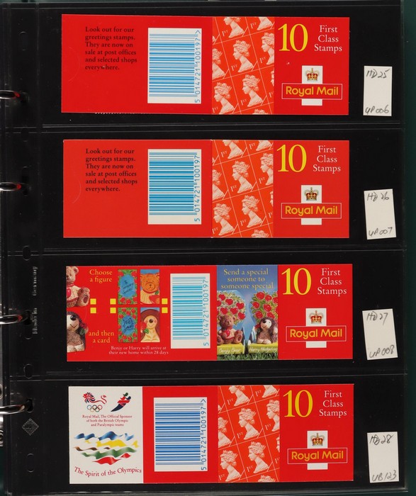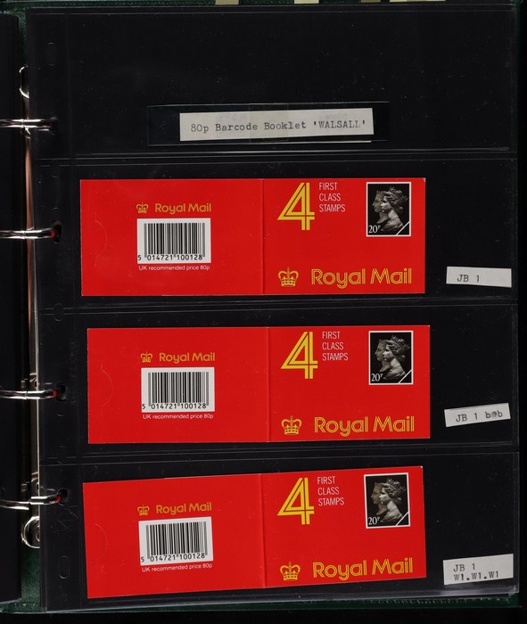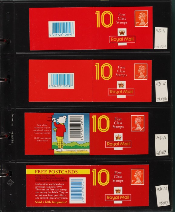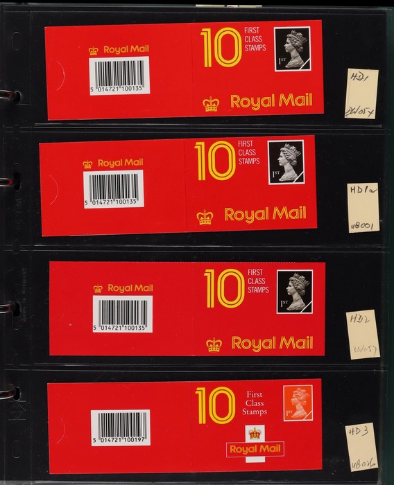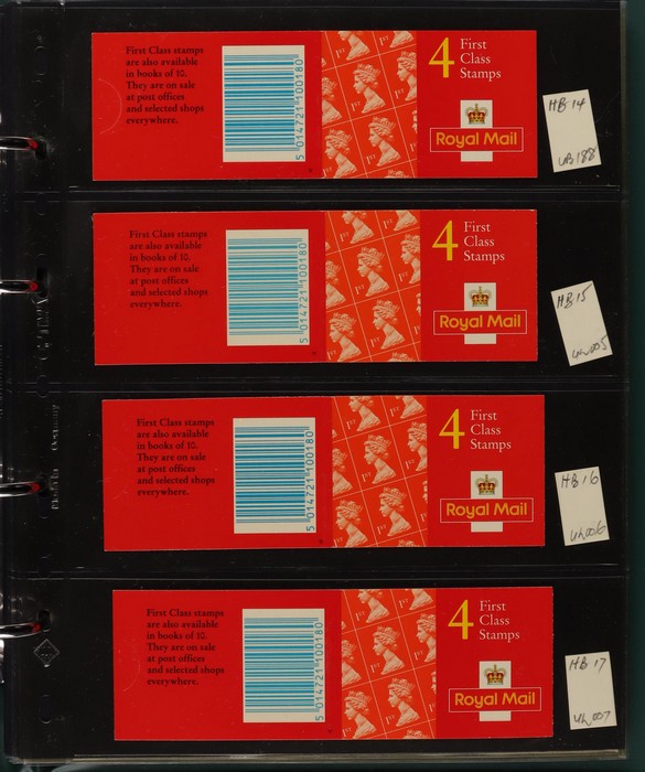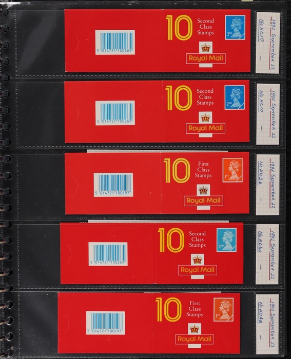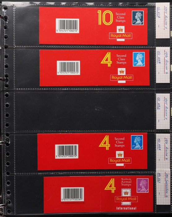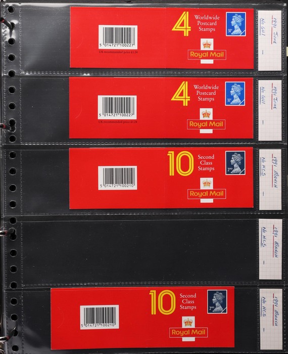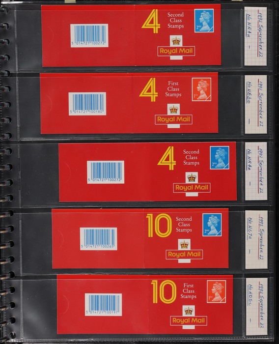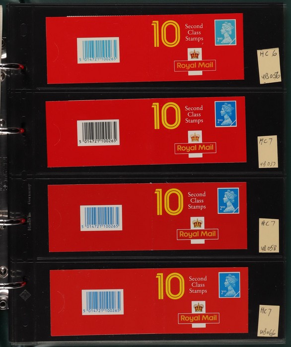 1989-92 in green binder with 2nd Class booklets of 4 stamps SG H4a (2), 2nd Class Barcode booklets in panes of 10 stamps SG HC6a, HC7a, 7b (2), HC9 (2), HC10 (2). 1st Class booklets in panes of 4 SG HB3 & HB3a (2), HB4. 2nd Class booklets in panes pf