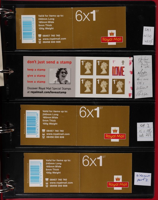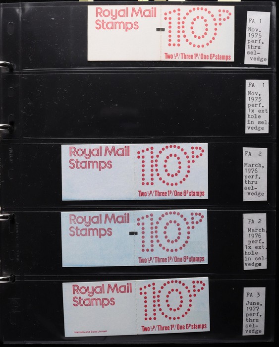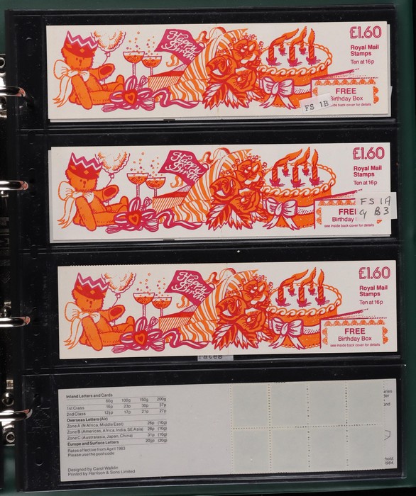 FO1-FO3, £1.50 booklets SG FP1-FP3, £1.54 booklets SG FQ1-FQ4, £1.55 booklets SG FR1-FR4, £1.60/£1.45 booklets SG FS1-FS4, many extras being cylinder panes, varieties A & B types (right & left selvedge) etc. MNH. FV