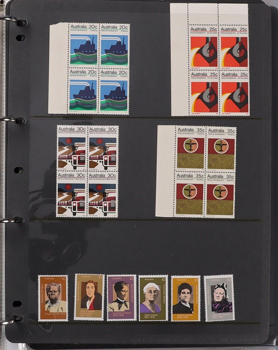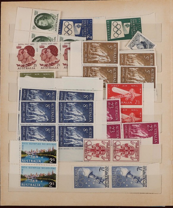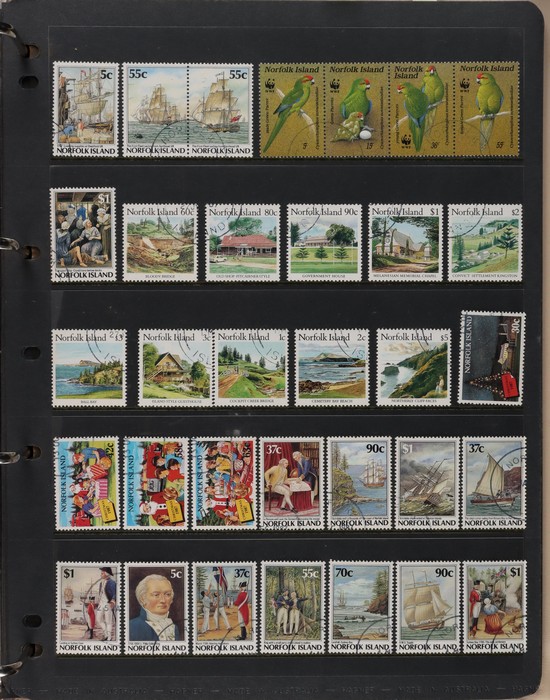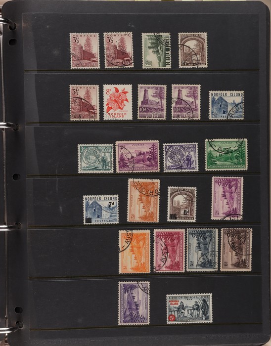 308 Collection in 11 albums/binders inc Aust States noted NSW 1885 10/- perf 12 SG 241b M cat £225 Queensland inc stamp duties, 1941 Buffalo Fly to 2/6, 1933 1d Betting Tax Tasmania inc 1900 Revenue 1d Blue 13 M/U, cut-out, Australian selection with extras inc 1942 2d purple KGVI blk of 6, one with 'medallion flaw' MNH, other commems M/MNH Canberra bklt (flts) then other Decimals in blks & sheets FV c$100. Norfolk Is 1947 to 1980s inc 1960 to 10/- (2) MNH, opt specimen (3) MNH also Used collection, decimals MNH (VF $50), AAT selection, Christmas Is 1958 to 1990s inc 1958 QEII set, 1968-70 Fish MNH. Then extensive later (FV $120), Cocos Is 1963 to 1990 noted 1990-91 Surcharge part self (no official) 1990 $5 Airmail post 1970s VF $50+. Papua New Guinea 1960s to 1970s in blks & sheets. FV $70+ Kina. Some mixed condition majority F/VF. (3000+).