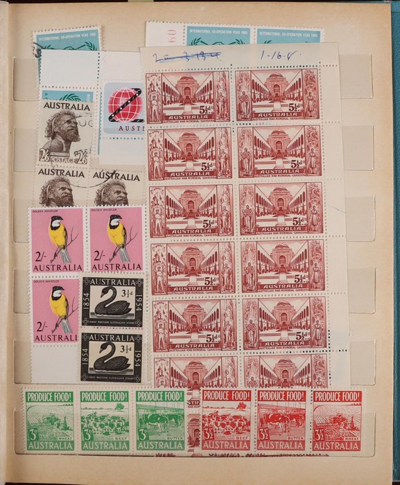 292 Carton lot of collections with Norfolk Is 1947-72 near comp MNH (retail $320) inc 1953 Pics to 5/- brown Bridge, 1960 Defs to 10/- Bird, 1967 Ships & 1969 Birds to 10/-, plus duplicated decimal Pics & Commems. AAT 1957-73 near comp MNH ($90). Australia booklets (46) to 1972 Prime Ministers (ACSC cat $1465), all very mixed condition with variable contents (some missing stamps), inc 1942 KGVI 2½d red (cover only, cat $150), other pre-decimals (15) to 1965 QEII 5d red & decimals (30). Also 1996 Indonesia Cuscus Joint Issue booklet (4, cat $100 ea, $400). Australia 1966-75 near comp MNH collection (retail $200) in 60 black page Lighthouse s/book inc 1966 Defs to $4 King & all better 1970s Commem sets inc 1971 Christmas 7c blk of 7. Also 1990s PO books (4, original issue cost $50) & small 1980s FDC collection New Zealand 1970s MNH Pic/Commem accumulation in blks & multiples (odd tones) inc 1971 Roses, City Centenaries & 1972 Alpine Flowers, Cars, plus Health & Christmas issues. East Europe 1960s-70s Pic collection (100s) in s/book. Finally semi-sorted mess in 2 binders inc 1997 Diana Memorial Commems with Bahamas 15c, Tokelau $1 & Vanuatu 95c MNH (100 of ea) in sheets of 50 (SG cat £200 = A$400). Some Sl mixed condition MNH/M/U. (Many 100s)