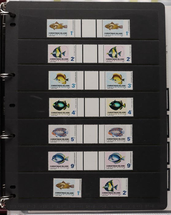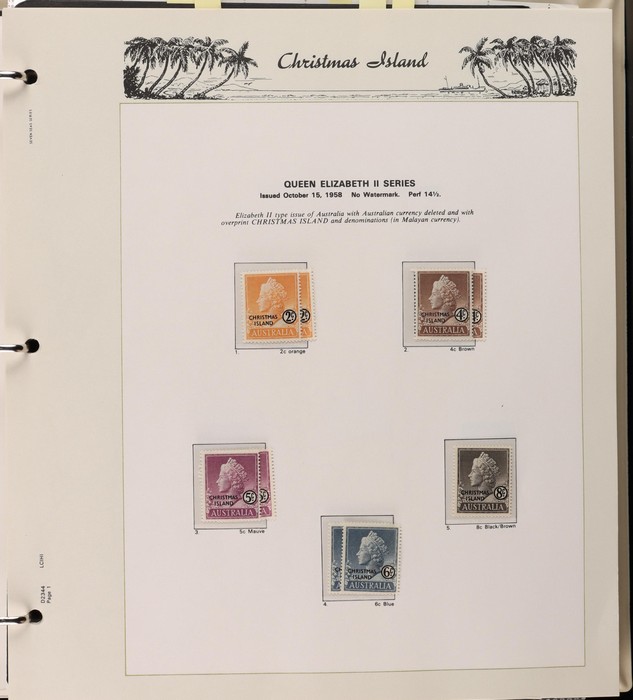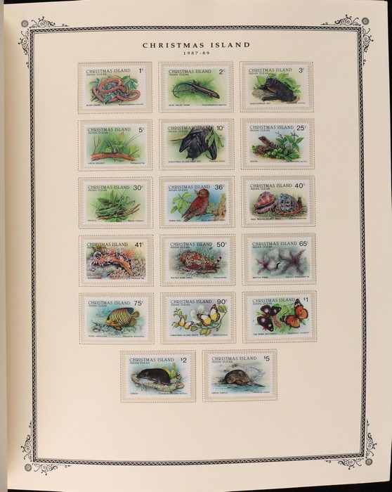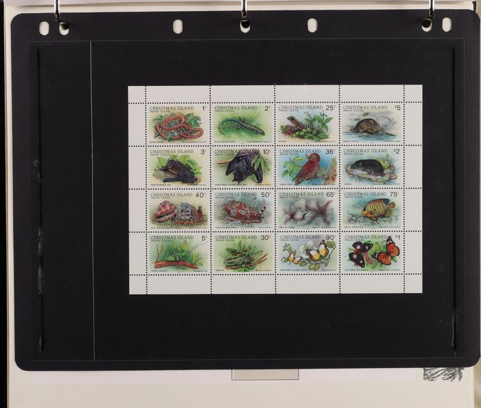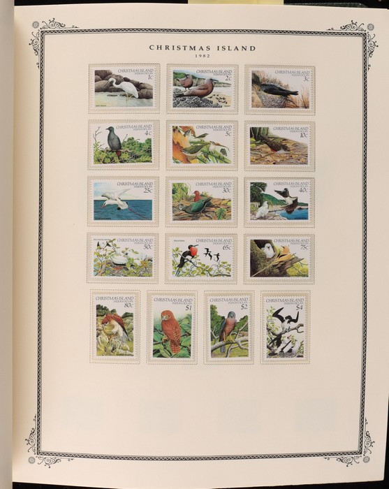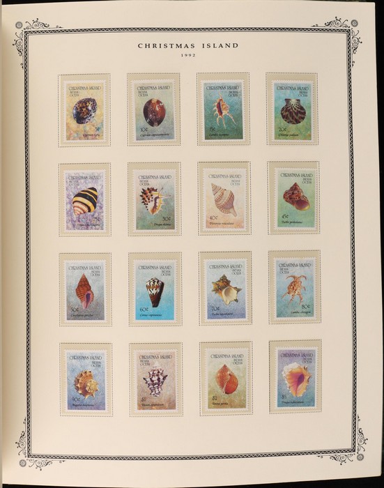 297 imageChristmas Island: 1958-92 MNH collection/accumulation in thick maroon binder with 1958 QEII Defs to $1 (3), plus extra sets CTO (2) & M (2). 1963 Pics to $1 Bird (9), plus extra set CTO. 1968 Fish to $1 gutter prs. 1972 Ships sets (6) inc PO Packs. 1982 Birds PO Pack, 1987 Wildlife sets of 16 (2), sheetlets (8) & PO Packs (2), retail $680. 1990 Transport set to $5, plus PO Pack. 1992 Shells sets (2) inc PO Pack, plus extra $5 (5) with Kuala Lumpur Exhibition opts (cat £45). Also 1977, 80, 83, 87, 88, 90 & 92 Year packs (these not often seen), plus selected M/sheets FV $350, retail $1500. (Image1) (Image2) (Image3) (Image4) (Image5) (Image6) (Image7) (Image8) (Image9) (Image10) (Image11) (Image12) (Image13) (Image14) (Image15) (Image16) (Image17) (Image18)