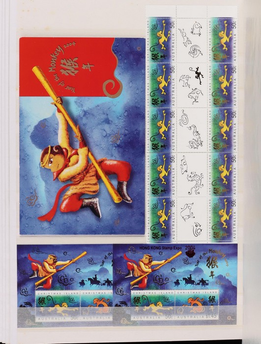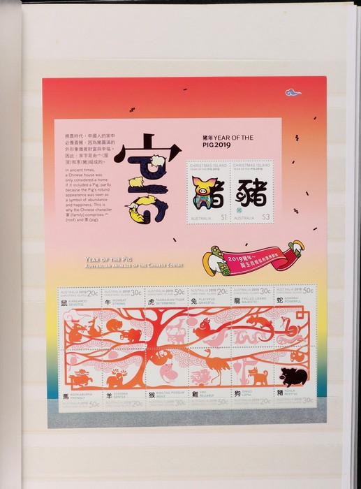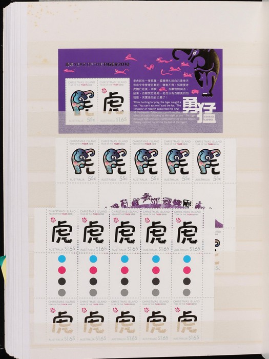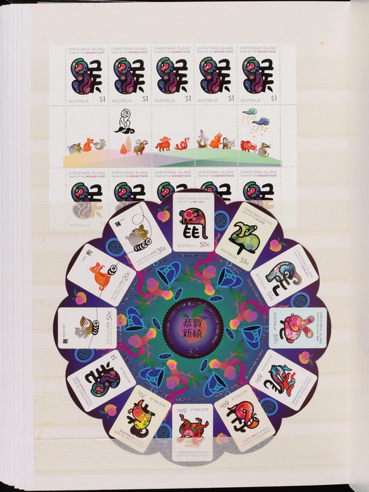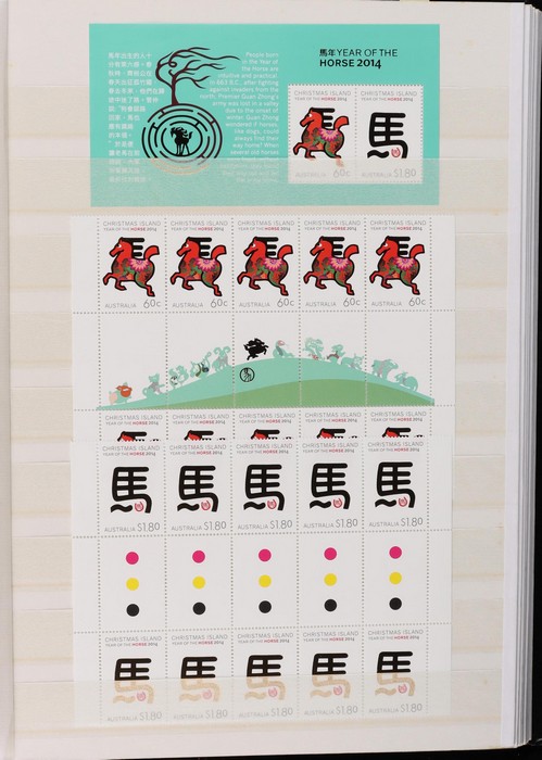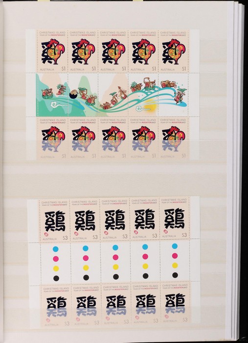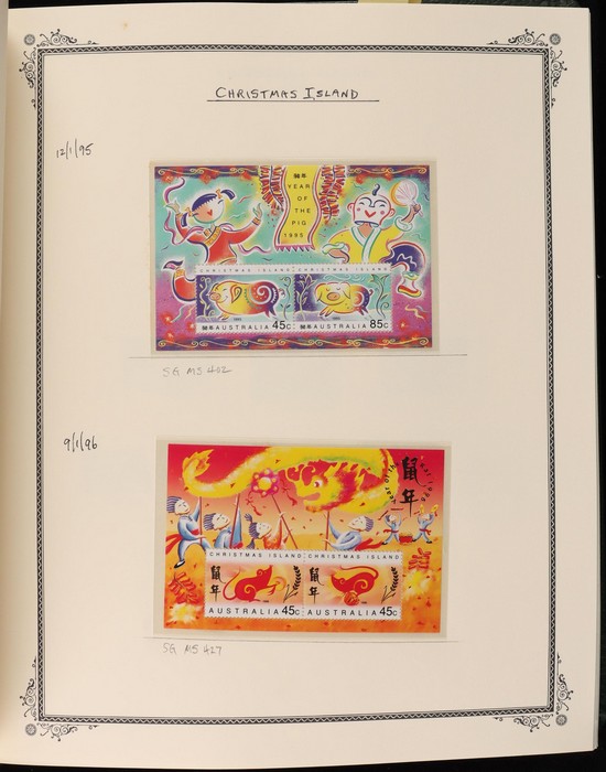 300 imageChristmas Island: 1994-2019 Chinese New Year collection in thick s/book with M/Sheets (31) inc Exhibition opts (5). Large sheetlets set of 18 2002-19. Lunar New Year Cycle sheetlets for 2007, 2010, 2013 & 2016. Gutter blks of 10 (33) to 2018 inc 1995 45c & 85c. 2007 50c & $1.45, 2009 55c & $1.65, 2010 55c & $1.65, 2011 60c & $1.80, 2012 60c & $1.80, 2013 60c & $1.80, 2014 60c & $1.80, 2017 $1 & $3 sets. 1995-2008 PO Packs (14) inc 2004 Monkey & 2007 New Year Cycle, plus others inc 2 booklets & 2009, 2011 Exhibition sheetlets. All fresh MNH, FV $520. (Image1) (Image2) (Image3) (Image4) (Image5) (Image6) (Image7) (Image8) (Image9) (Image10) (Image11) (Image12) (Image13)