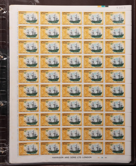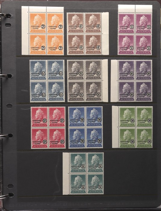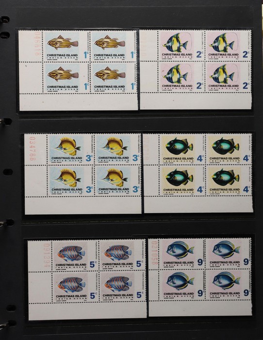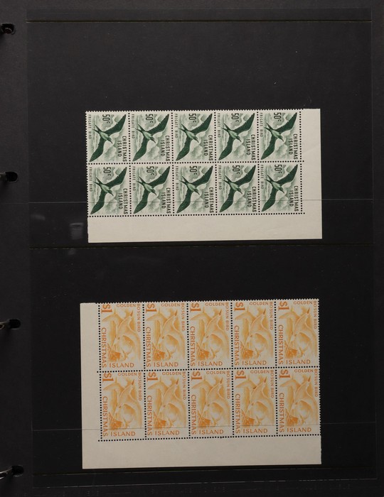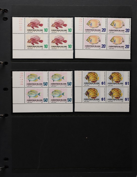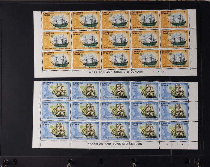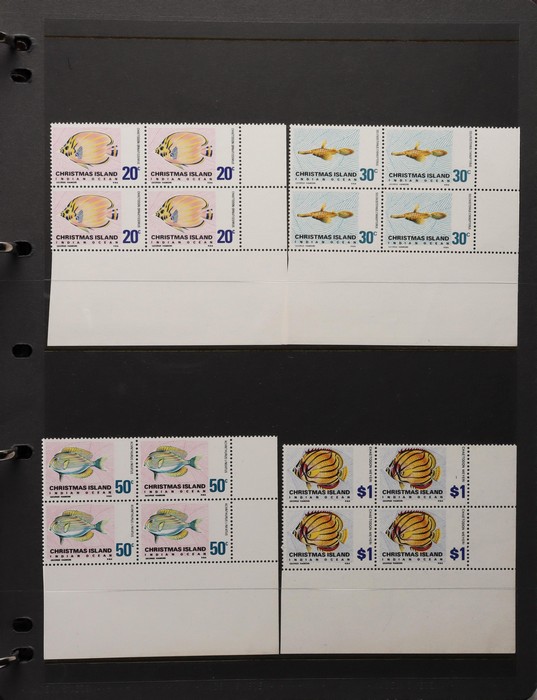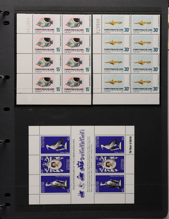 296 imageChristmas Island: 1958 QEII set to $1 blks of 4. 1963 Pic sets to $1 Bird cnr blks of 10. 1968 Fish (8) sets with sheet number blks of 4 & LR cnr blks of 4. 1976 Ships to $1 in comp sheet of 50, plus imprint blks of 15. 1994 Lunar New Year M/Sheets (6) with Hong Kong or Melbourne Exhibition opts. All fresh MNH. Retail $1580. (Image1) (Image2) (Image3) (Image4) (Image5) (Image6) (Image7) (Image8) (Image9)