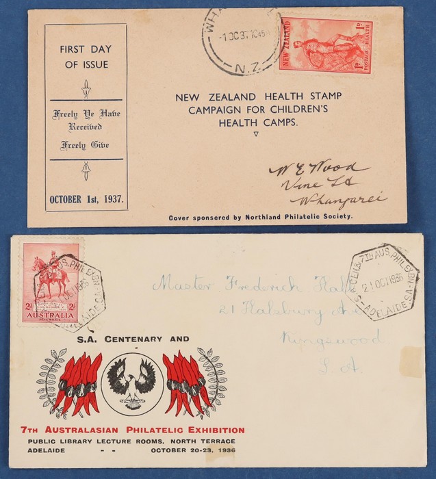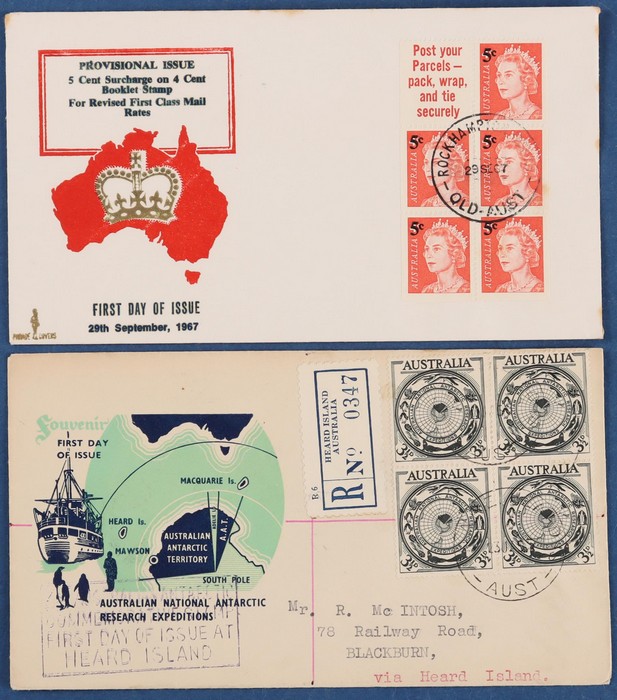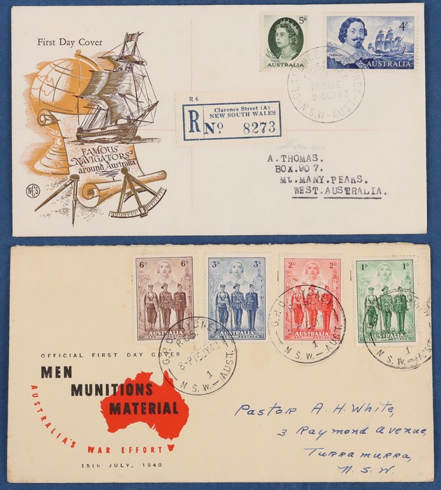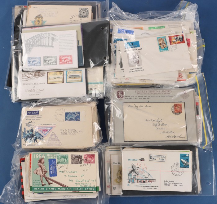 311 imageCovers: British Commonwealth FDC accumulation with Australia (90) 1930s-60s inc 1938 NSW Sesqui set, 1940 AIF, 1946 Mitchell, 1947 Newcastle, 1950s/60s pre-dec Commems, 1963-64 Navigator set of 6 to £2 King, plus extra £2, plus 1966 high val $1-$4, plus 1980s Die Proof Replica Cards (12). Africa (45) mainly 1960s KUT, Nigeria & Zimbabwe Pic/Commem sets. Aust Antarctic Territory 1950s Base covers (12 mixed). GB FDC (28) inc 1937 KGVI 2d, 6d, 8d (SG cat £140). New Zealand (90) mainly pre-dec Healths inc Camp cds. Norfolk Is (30) inc 1970 Birds set on 4 FDC, plus misc others (30) inc India, PNG, Malaysia & Nauru. (325) (Image1) (Image2) (Image3) (Image4) (Image5) (Image6) (Image7) (Image8) (Image9) (Image10) (Image11)
