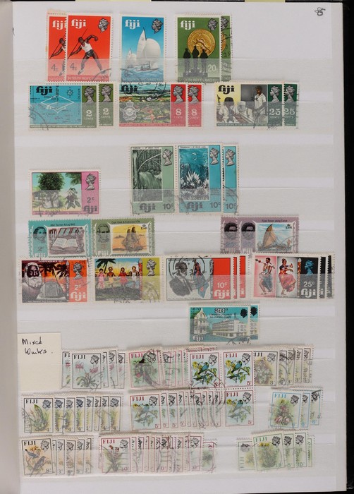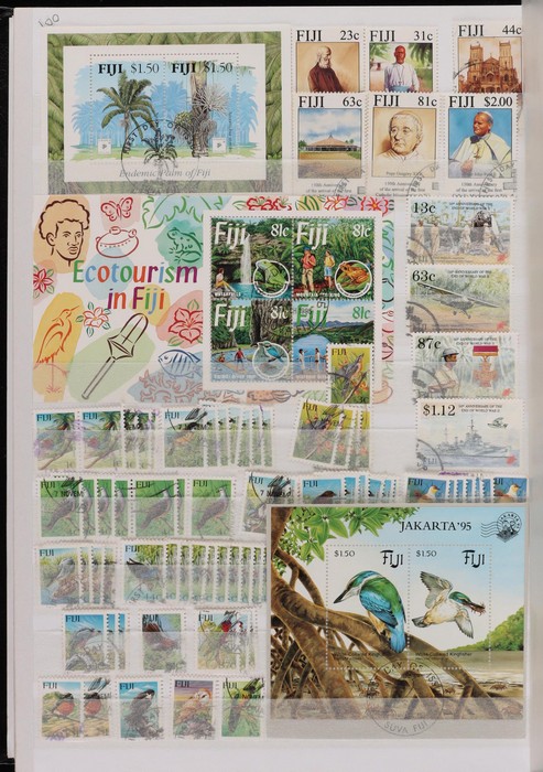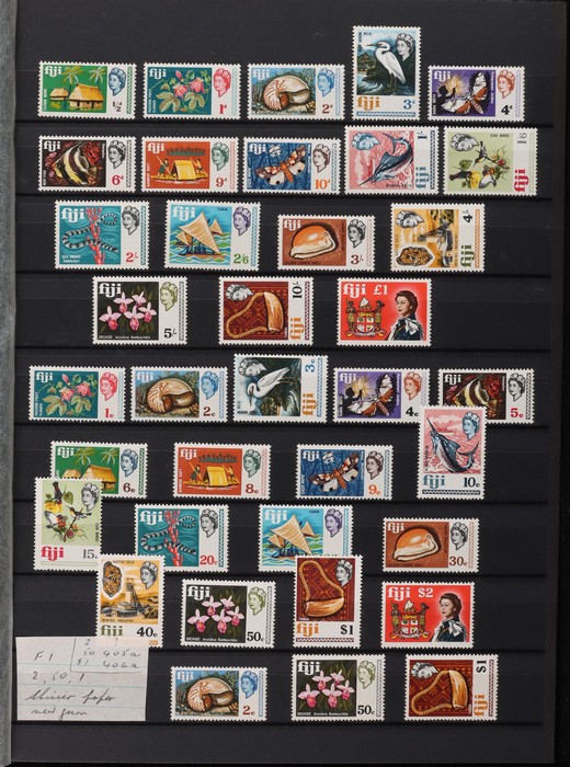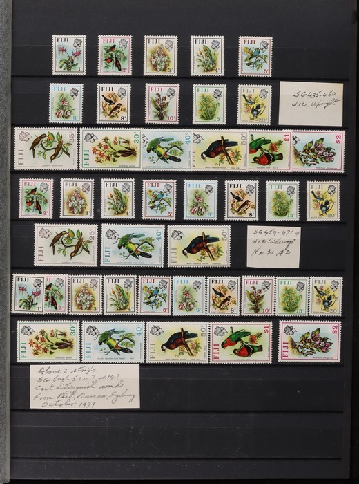325 imageFiji: 1959-80 virtually comp collection inc 1959-63 QEII to £1 wmk script CA, 1962 to £1 wmk Mult Crown/CA, 1968 Pics to £1 Arms, 1969 dec Defs to $2 Arms. 1971 Birds to $2 (SG 435-50 cat £40), 1972 Birds (SG 459-71) to 50c (cat £55) & 1975 Birds to $2 (SG 505-20 cat £27). 1979 Architecture to $5, plus 54 other Pic/Commem sets & 2 M/Sheets. Odd light tropical spot but most better sets are F-VF MNH. SG cat £300 = A$575. (325) (Image1) (Image2) (Image3) (Image4)