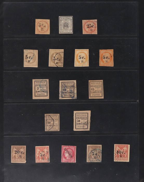 326 imageFrance & Colonies: 1852-1960s selection inc France from 1853 Emperor 10c & 20c imperf. 1926-27 War Orphans set to 5F + 1F. 1936 Transatlantic 10Fr Used pr. General Colonies 1859-70 Eagle vals to 80c. Reunion 1852 Typeset 15c reprint. 1885-86 Surch inc 5c & 25c Eagle, 5c on 30c Emperor 5c on 40c Ceres 5c on 40c, 10c on 40c on 30c Peace & Commerce. Also 1889 Postage Due set to 30c. Most G-VF M/U, some mixed. SG cat £1300+ = A$2800+. (57) (Image1) (Image2) (Image3) (Image4) (Image5) (Image6)