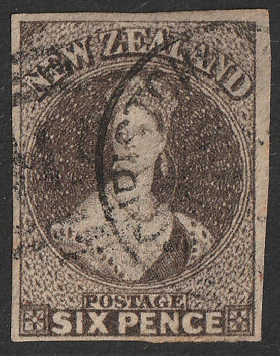 6d black-brown imperf, wmk large star. VFU, 4 margins, barred + Christchurch cds. CP A5b(1) cat NZ$450. Scott 14d. SG 41 cat £200. (P) (Image1)