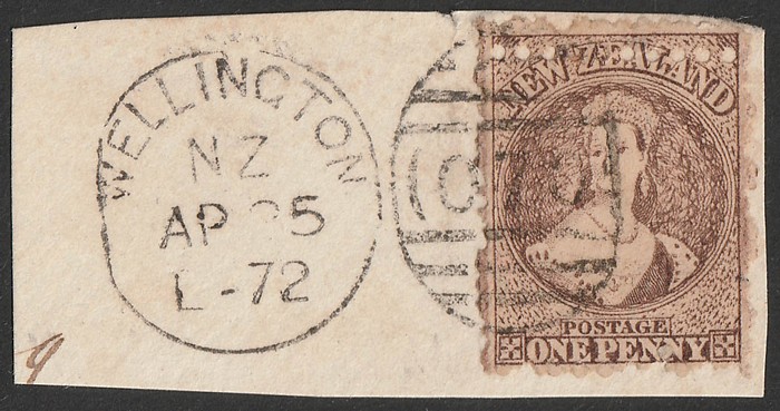 1d brown wmk Large Star, mixed compound perfs 12½ & 10 (double row) at top, perf 11½ at left & right & perf 10 at bottom. Superb U, on piece with barred oval '070' pmk, plus 'Wellington NZ AP 25 K-72' cds. CP A1p (2)(z) cat NZ$500+