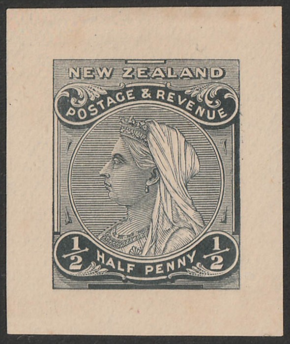 Sideface ½d black imperf DIE PROOF with wide margins. Superb UN as made. SG 217(DP). CP DDP1(2) cat 'from NZ$1250+'. Very rare. (P) (Image1)