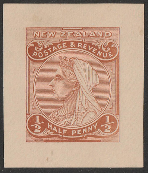 Sideface ½d red-brown imperf DIE PROOF with wide margins. Superb UN as made. SG 217(DP). CP DDP1(2) cat 'from NZ$1250+'. Very rare. (P) (Image1)