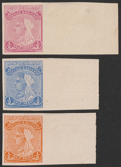 Sideface ½d rose, ½d blue & ½d orange PLATE PROOFS, all right marginal. SG fresh UN as made. SG 217(PP). CP DDP1(1) cat 'from NZ$100' ea. (3) (P)