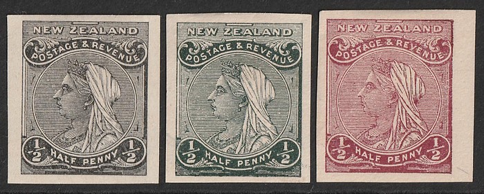 Sideface ½d maroon, ½d blackish-green & ½d black PLATE PROOFS. VF fresh UN as made. SG 217(PP). CP DDP1(1) cat 'from NZ$100' ea. (3) (P) (Image1)