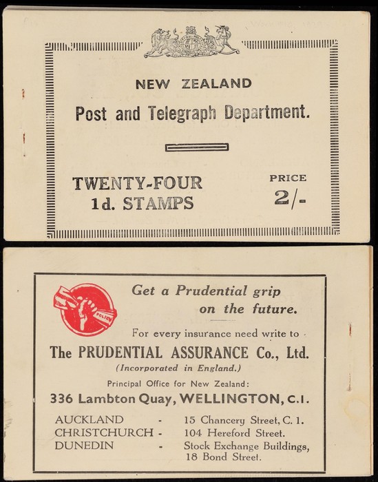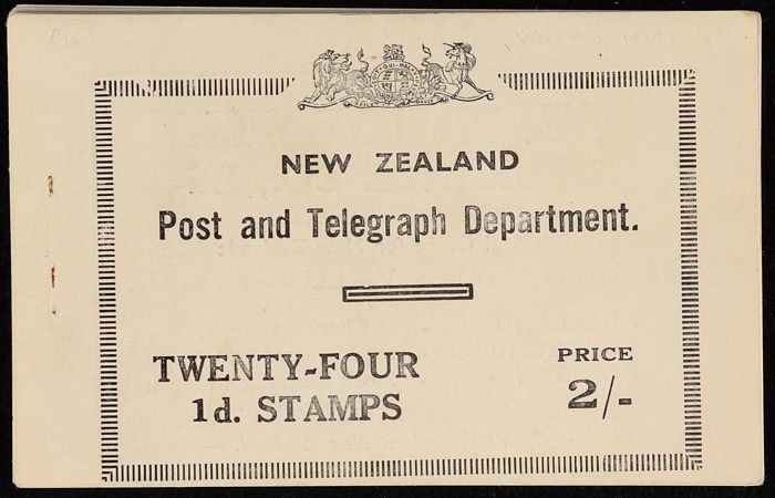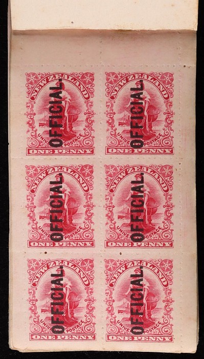 booklet with 1d Universal 20 panes of OFFICIAL opts. MNH, some toning, staple flt etc. CP Wo2a cat NZ$2000, cat NZ$6000 as single panes (as £100 per pane). SG OB1 cat £1500, or O60a cat £2000 as single panes both for M, while MNH