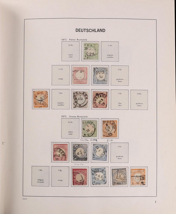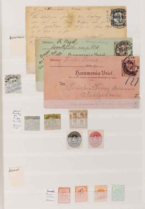 331 imageGerman Private Posts & States: 1852-1900 collection in s/book. States inc Brunswick 1852 Arms 2sgr & 1861 1sgr. Hamburg 1859 Arms vals to 7S, imperf. Private Posts Altona - Wuppertal inc Bergedorf 1887 Animals to 15pf. Berlin selection of diff posts inc 2 covers. Bochum selection, plus p/card. Brunswick p/cards (3). Breslau 1897 Kaiser Birthday. Range of Hamburg Posts, Lubeck Ships to 15pf, plus Portrait set. Most G-VF M/U, some mixed. Mi cat €1200+ = A$2100+. (275 + 18 covers/cards) (Image1) (Image2) (Image3) (Image4) (Image5) (Image6) (Image7) (Image8) (Image9) (Image10) (Image11) (Image12) (Image13) (Image14) (Image15)