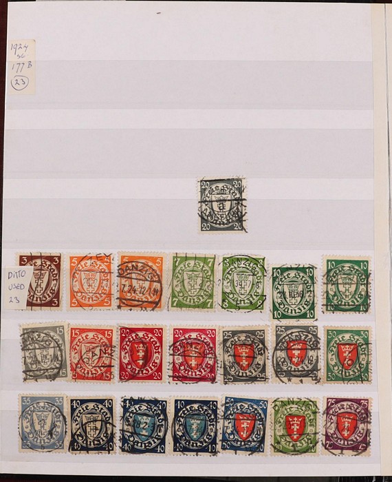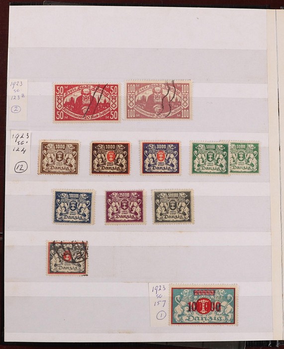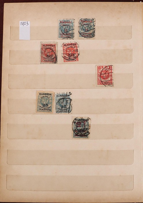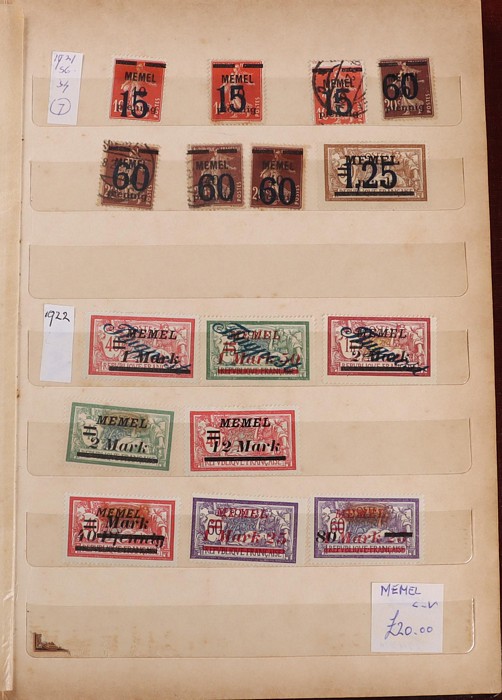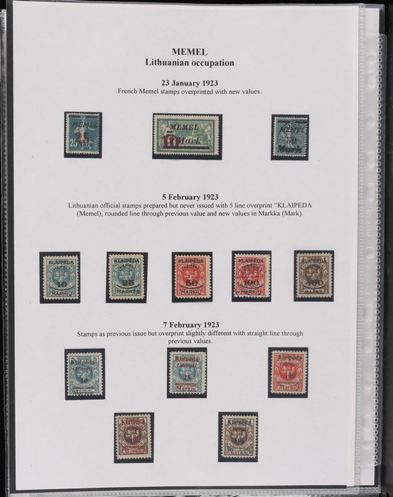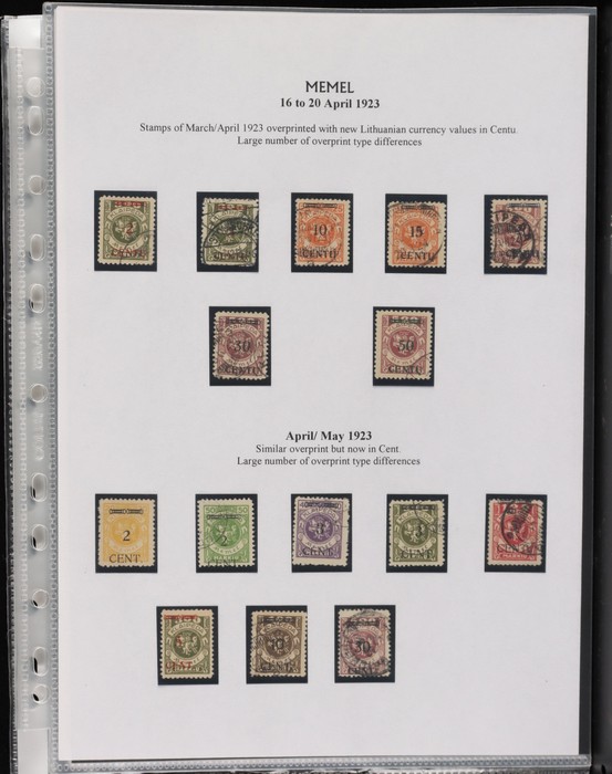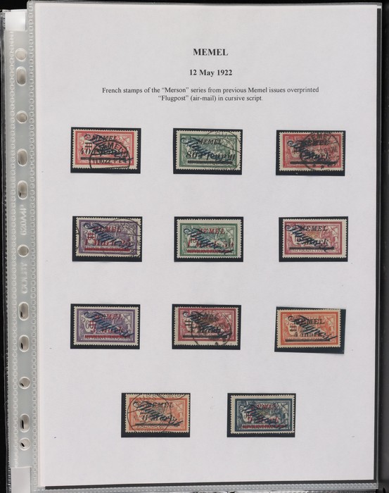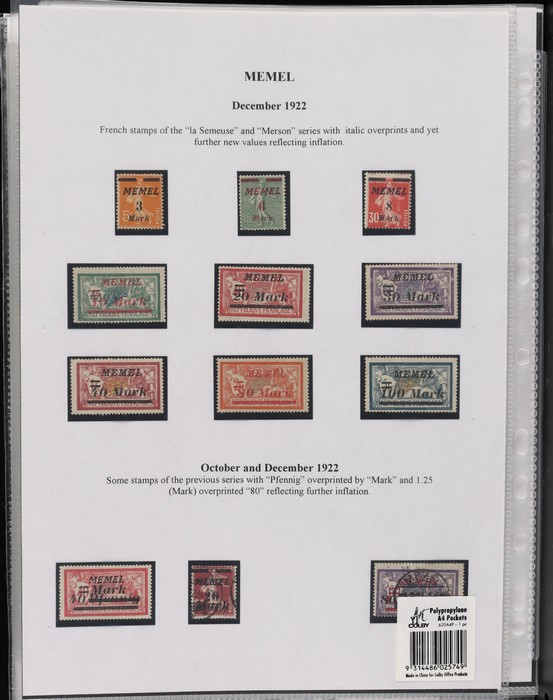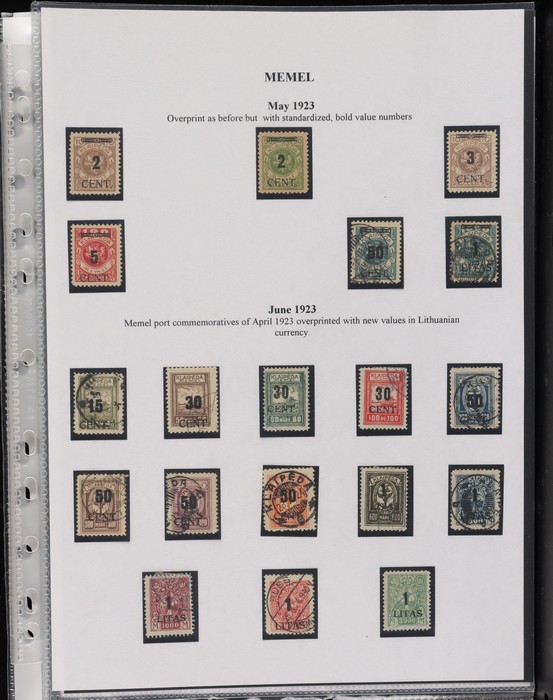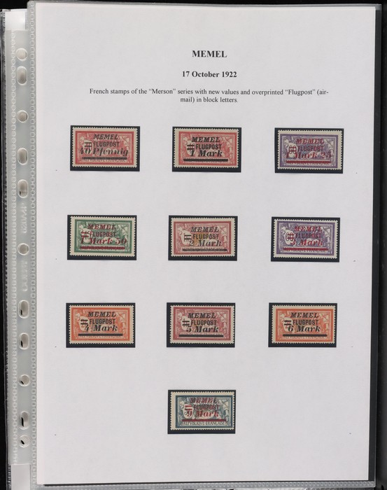 340 imageGermany - Memel: 1920-23 collection on pgs in binder. 1920 opt Germania 5pf-20Mk. 1920 opt French issues 5pf-4Mk. 1922 opt French issues 5pf-9Mk. 1922 Surch to 100Mk. 1922 Airmail set to 9Mk & 'FLUGPOST' opt to 9Mk. Lithuania Occup 1923 opt Arms to 400Mk. 1923 Arms to 100Mk. 1923 Pic set to 300Mk. 1923 Inflation opt to 600Mk. 1923 'Cent' opt Pic to 1L. F-VF M/U. SG cat £1700+ = A$3300+. (Image1) (Image2) (Image3) (Image4) (Image5) (Image6) (Image7) (Image8) (Image9) (Image10) (Image11) (Image12) (Image13) (Image14) (Image15) (Image16) (Image17)