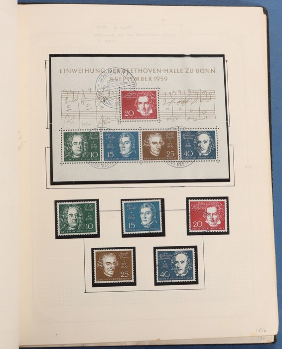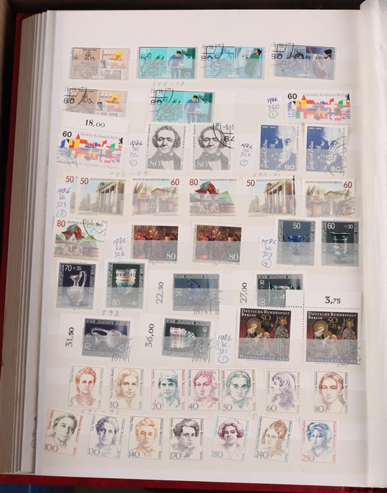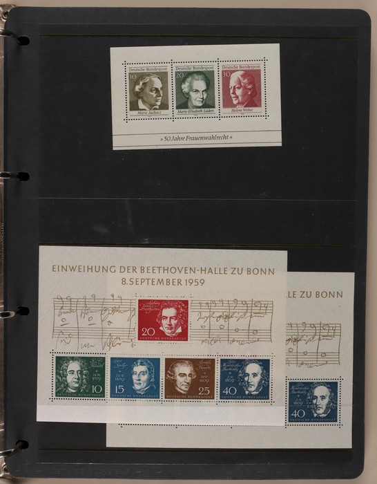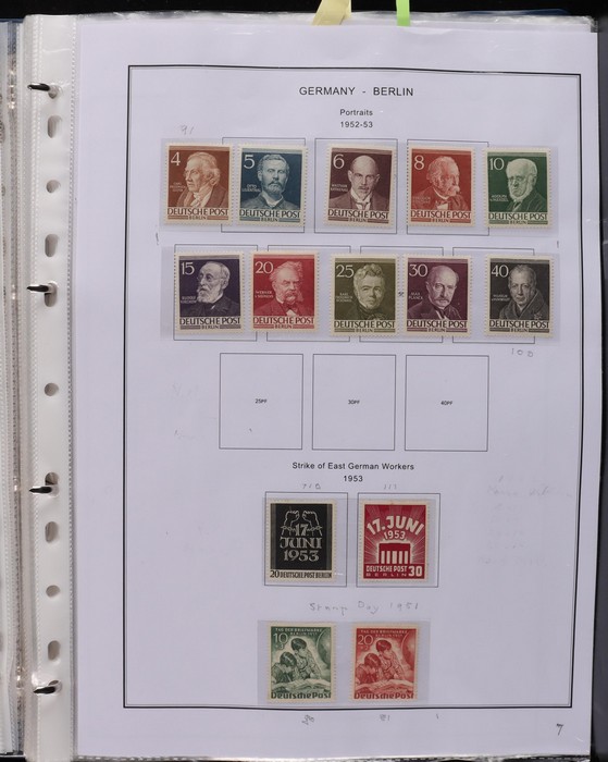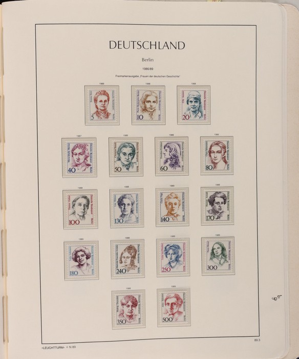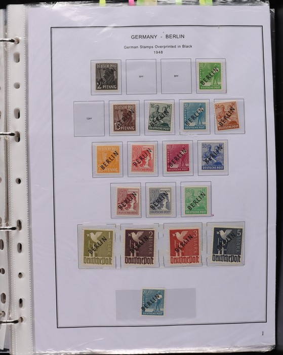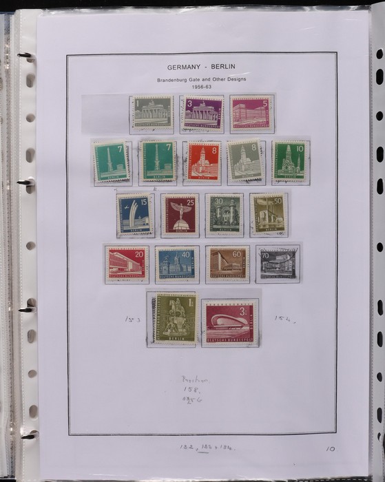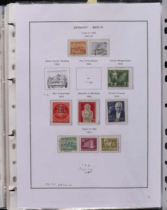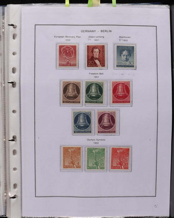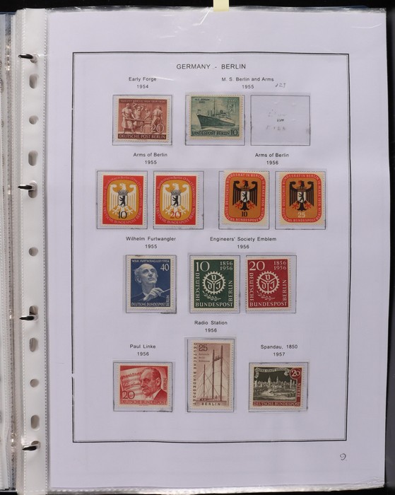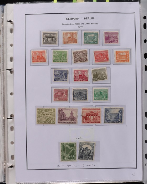 344 imageGermany - West Berlin, 1949-90 collection in Lighthouse hingeless album inc 1949 red Berlin opt to 1M, 1949 Berlin Relief Fund set & M/Sheet, 1952 Olympics set, 1952 Famous Berliners set, 1986 Famous German Women set, virtually comp from 1957-1990 with many sets, range of M/S, booklet panes, postal stationery etc. Mainly VF MNH from 1957, earlies mostly MLH & VFU. SG cat £6000 = A$12,000, plus high cost of album. (800 + 15 M/S, 10 P/Cs). (P) (Image1) (Image2) (Image3) (Image4) (Image5) (Image6) (Image7) (Image8) (Image9) (Image10) (Image11) (Image12) (Image13) (Image14) (Image15)